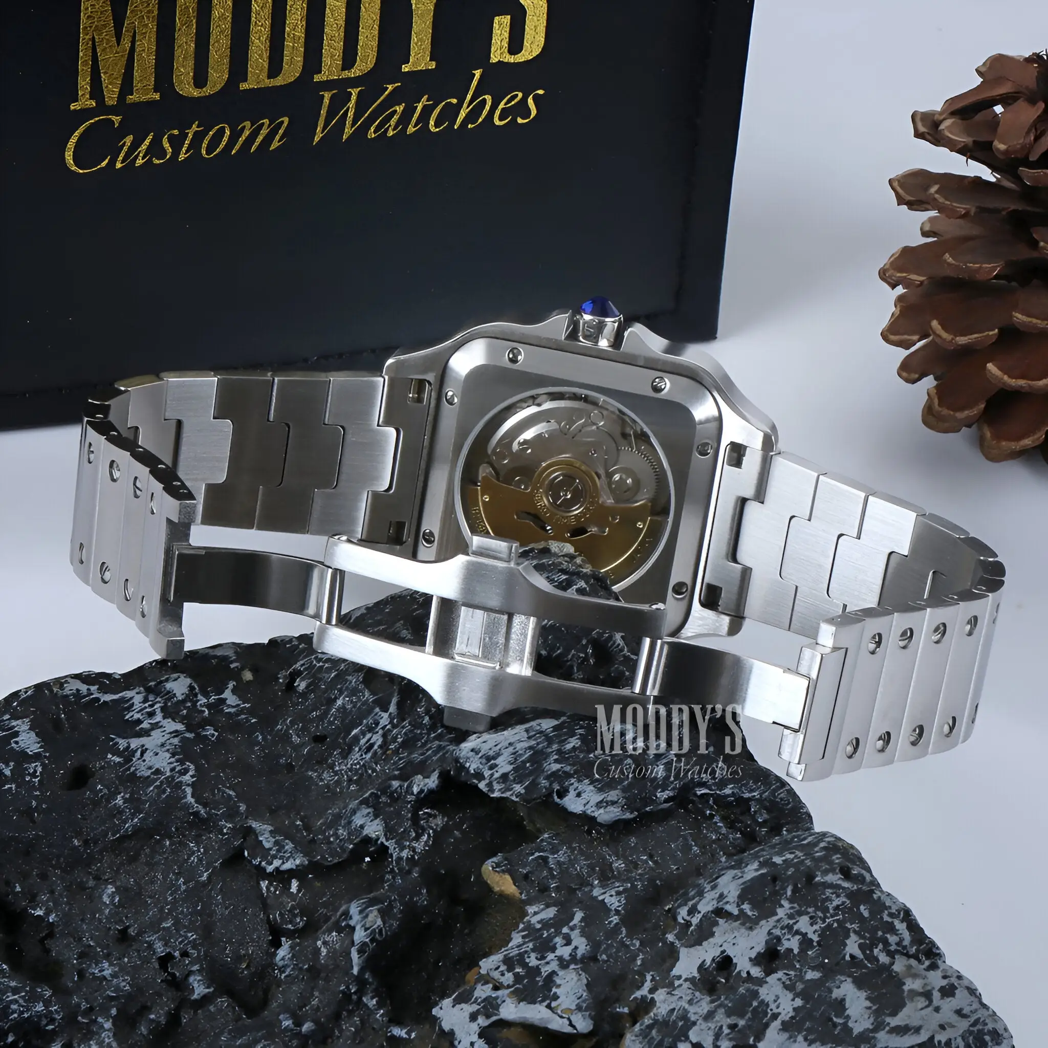 Inspired by the iconic Santos design, and featuring the prestigious Seiko NH35 automatic movement, we present the Seiko Mod Santos. A 38 mm high-end quality watch combining the perfect alliance between excellence and accessibility.